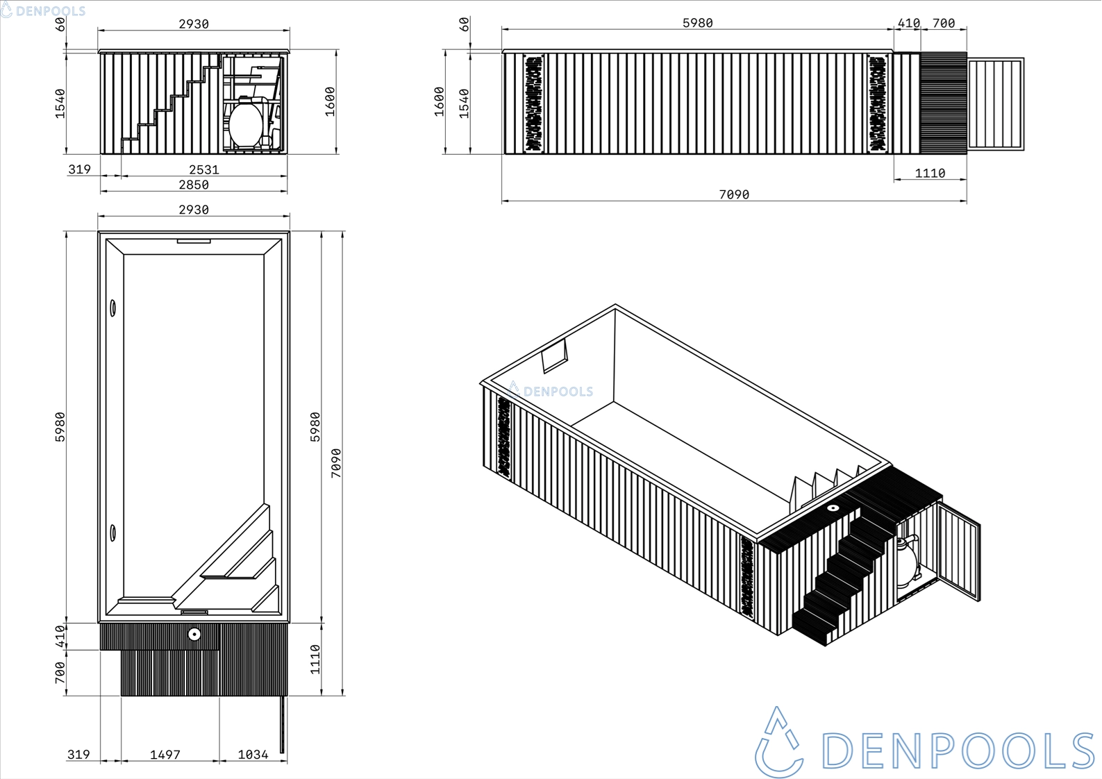Das Pool wird unseren Kunden komplett gebrauchsfertig geliefert. Alle Seiten sind mit 0,5 mm dicken, verzinkten Stahlpaneelen in anthrazitgrauer Farbe verkleidet.