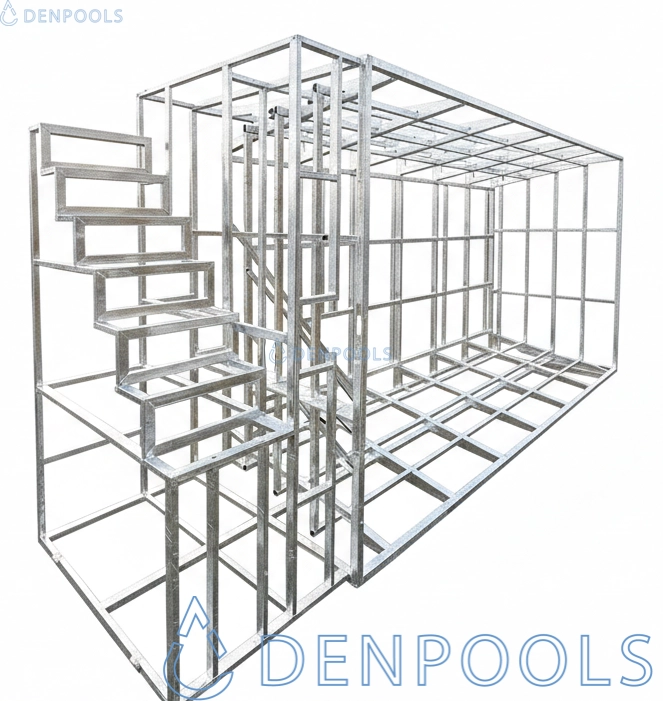 Für die Produktion dieser Swimmingpools verwenden wir geschlossene Metallprofile verschiedener Arten mit einer Dicke von 2 mm bis 5 mm, je nach Verwendung und Position des Profils. Das Pool wird auf einem Metallrahmen montiert. Am unteren Teil ruht das Pool auf einer speziell vorbereiteten Basis — OSB-Platten 22 mm und Hartschaum.