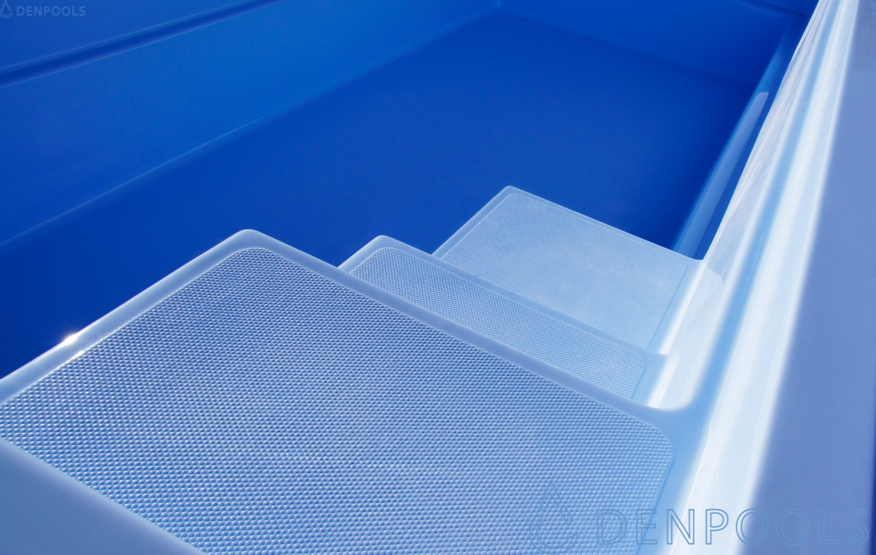 Hochwertige Wanne aus Polyester-Glasfaser-Laminat (GFK), ausgestattet mit Stufen, die auch als bequeme Sitzgelegenheit dienen können.